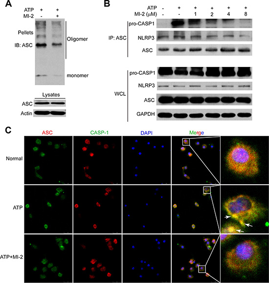 Figure 8: MI-2 suppressed NLRP3 inflammasome complex assembly induced by ATP. (A) THP-1 cells were treated with MI-2 (4 μM) for 1 h, following by 1 h incubation of 5 mM ATP. ASC oligomerization and redistribution was determined by immunoblot of ASC in cross-linked pellets (upper panels) and in cell lysates (lower panels). (B) THP-1 cells were treated with MI-2, following by 15 min ATP treatment. Cell lysates were immunoprecipitated with anti-ASC. (C) LPS-primed adherent bone marrow derived macrophages (BMDM) were treated with MI-2 (4 μM) for 1 h, followed by 5 mM ATP treatment for 15 min. The treated cells were analyzed by immunofluorescence cytochemistry (×100).