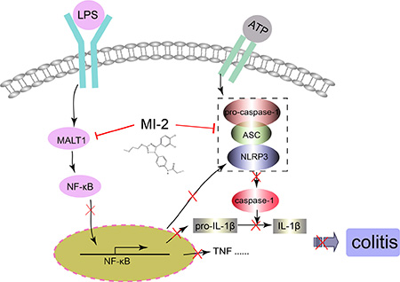 Overall, our study found that new type inhibitor MI-2 has certain improvement effect on DSS-induced murine colitis by targeting MALT1-NF-κB and NLRP3 signal pathway, which suggests a new strategy for clinical treatment of colitis.