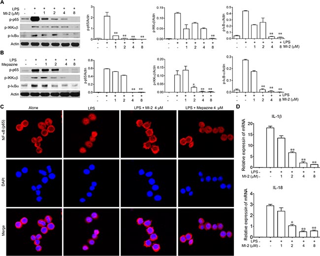 Figure 6: MALT1 inhibitors decreased activation of NF-kB signaling pathway in vitro. (A, B) Peritoneal macrophage cells were treated with LPS alone or with MI-2, Mapezine for 1 h. Then proteins were collected and phosphorylation of p65, IκBα, IKKαβ were analyzed by western blot. (C) Peritoneal macrophage cells were treated with LPS alone or with MI-2 and Mapezine (4 μM) for 1 h, the localization of p65 was examined by immunofluorescence stain. (D) Peritoneal macrophage cells were treated with LPS alone or with MI-2 and Mapezine for 12 h, mRNA level of IL-1β and IL-18 were analyzed by RT-PCR. *P < 0.05, **P < 0.01 vs. LPS group.