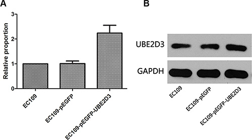 Figure 1: Verification of UBE2D3 overexpression by PCR and western blotting. (A) Relative to EC109 cells, the mRNA expression level in EC109-pEGFP-UBE2D3 cells was 2.239 (P = 0.024, t = 3.712), and in EC109-pEGFP cells was 1.010 (P = 0.936, t = 0.089). (B) Relative to EC109 cells, the protein expression level in EC109-pEGFP-UBE2D3 cells was 1.362 (P = 0.004, t = 5.816), and in EC109-pEGFP cells was 0.888 (P = 0.241, t = 1.377).