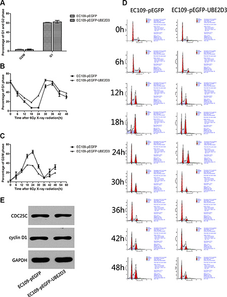 Figure 3: Effects of UBE2D3 overexpression on the cell cycle with or without IR in EC109 cells. (A) Before X-ray treatment, cell cycle was detected by flow cytometry. In EC109-pEGFP cells and EC109-pEGFP-UBE2D3 cells, the proportion of G2/M phase was 3.323 ± 0.895 and 3.247 ± 1.165, respectively (P = 0.933, t = 0.090). The proportion of G1 phase was 60.640 ± 1.337 and 62.383 ± 2.788, respectively (P = 0.404, t = 0.977). (B) After 6 Gy X-ray treatment, cell cycle was detected each 6 hours, the percentage of G1 phase in EC109-pEGFP-UBE2D3 cells was obviously higher than that in EC109-pEGFP cells. However, the Figure 3C showed that the percentage of G2/M phase in EC109-pEGFP-UBE2D3 cells was obviously lower than that in EC109-pEGFP cells. (D) Cell cycle was evaluated by flow cytometry. (E) Western blotting analysis showing the cell cycle check point proteins of CDC25C and cyclin D1 expression level had no significant difference between the two kinds of cells. Experiments were repeated 3 times with similar results.