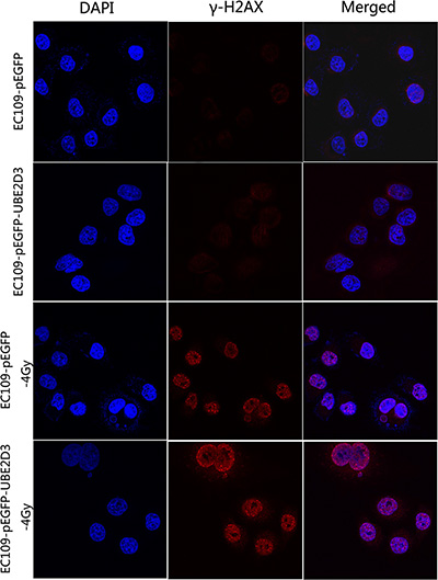 The immunofluorescence results showed that the level of γ-H2AX (a DNA damage marker) was little difference between the two groups without IR; However, the X-rays treatment of UBE2D3 overexpressing cells led to an enhanced DNA damage foci (Figure 5).