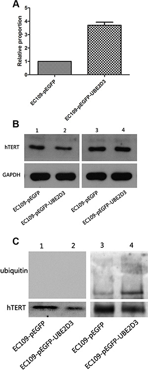 Figure 7: hTERT was degraded by the proteasome pathway mediated by UBE2D3. (A) mRNA of hTERT in EC109-pEGFP-UBE2D3 cells was much higher than that in EC109-pEGFP cells (P = 0.000, t = 28.974) (B) Line 1 and 2 were tested before MG132 treatment, result showed that the up-regulation of UBE2D3 decreased the expression of hTERT. Line 3 and 4 were tested after 2 hours of MG132 desposed, aboundance of hTERT in EC109-pEGFP-UBE2D3 cells almost reached the same level to that in EC109-pEGFP cells. (C) hTERT protein was obtained by co-immunoprecipitation assay, and anti-ubiquitin antibody was used in immunoblotting to value the ubiquitination of hTERT. Almost discovery nothing in line 1 and 2 without MG132 treatment, but after MG132 treatment, the ubiquitin level in EC109-pEGFP-UBE2D3 cells was dramatic higher than that in EC109-pEGFP cells. Indicated that ubiquitined hTERT was up-regulated by UBE2D3 overexpressing.