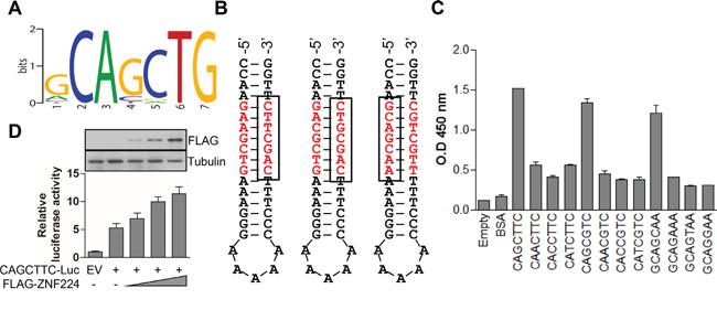 Figure 3: ZNF224 DNA binding motif characterization. A. DNA motif within ZNF224 enriched region from ChIP sequencing. B. Hair-pin loop structure containing 5′-CAGC-3′ sequence. C. Biotinylated oligo DNAs (5 μM) were fixed to streptavidin coated 96 well plates and purified FLAG-ZNF224 (50 ng) was loaded to each well. The bound FLAG-ZNF224 was detected with anti-FLAG antibody, and developed as described in the Methods section. Data are from at least three independent experiments (n=3). D. pGL3 vector containing (200 ng) 5′-CAGCTTC-3′ sequence with empty vector (E.V) or FLAG-ZNF224 (50, 100, and 200 ng) was transfected to MCF-7 cells for 24 h, and luciferase activity assay was performed. Luciferase activity was normalized to Renilla (100 ng) luciferase activity. The expression of FLAG-ZNF224 was detected with anti-FLAG antibody (inset). Tubulin was used as a loading control. Data are from at least three independent experiments (n=3).
