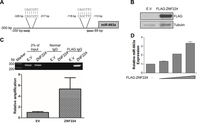 Figure 4: ZNF224 binds to miR-663a promoter. A. miR-663a promoter sequence analysis. Two regions containing 5′-CAGC-3′ sequence were found within - 500 bp. Arrow indicates primer binding sites for PCR. B and C. FLAG-ZNF224 was transfected to HEK293 cells, and ChIP assay using normal or FLAG IgG was carried out. PCR was performed using miR-663a promoter primers between -350 bp and -89 bp. In addition, ChIPed DNA was analyzed with qPCR. Data are from at least three independent experiments (n=3). D. FLAG-ZNF224 (0.5 1, and 2 μg) was transfected to MCF-7 cells in a dose-dependent manner for 24 h, and miR-663a transcript level was examined by qRT-PCR. miR-663a transcript level was normalized to U6 RNA. Data are from at least three independent experiments (n=3).