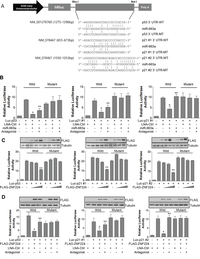 Figure 5: ZNF224 regulates promoter activity of p21 and p53 via miR-663a. A. the putative miR-663a binding sequences for the p53 and p21 3′ UTRs. Human p53 and p21 3’ UTR fragments containing either the wild type (WT) or mutant (MT) miR-663a binding sequences were cloned downstream of the luciferase reporter gene in the psiCHECK vector. B. MCF-7 cells were co-transfected with psiCHECK vector (200 ng) and Renilla vector (100 ng) in the presence or absence of miR-663a (20 nM), and in the presence or absence of miR-663a antagonist (40 nM). Luciferase activity was normalized to Renilla luciferase activity. Data represent the mean ± SEM of three independent experiments (*, vs. luc-p53 or luc-p21 #1 or luc-p21 #2/LNA-control (ctrl); **, vs. luc-p53 or luc-p21 #1 or luc-p21 #2/LNA-ctrl/miR-663a). C. MCF-7 cells were co-transfected with psiCHECK vector (200 ng) and Renilla vector (100 ng) in the presence or absence of FLAG-ZNF224. Luciferase activity was normalized to Renilla luciferase activity. The expression of FLAG-ZNF224 was confirmed using anti-FLAG antibody (inset). Tubulin was used as a loading control. Data represent the mean ± SEM of three independent experiments (**, vs. luc-p53 or luc-p21 #1 or luc-p21 #2/FLAG-ZNF224 (-)). D. MCF-7 cells were co-transfected with psiCHECK vector (200 ng) and Renilla vector (200 ng) in the presence or absence of FLAG-ZNF224, and in the presence or absence of miR-663a antagonist (40 nM). Luciferase activity was normalized to Renilla luciferase activity. The expression of FLAG-ZNF224 was confirmed using anti-FLAG antibody (inset). Tubulin was used as a loading control. Data represent the mean ± SEM of three independent experiments (*, vs. luc-p53 or luc-p21 #1 or luc-p21 #2/LNA-ctrl; **, vs. luc-p53 or luc-p21 #1 or luc-p21 #2/FLAG-ZNF224/LNA-ctrl). *P < 0.001, **P < 0.01.