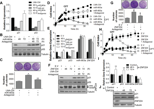 Figure 6: ZNF224 controls cell growth by regulating expressions of p21 and p53 via miR-663a. A and B. MCF-7 cells were transfected with LNA-ctrl or miR-663a (20 nM) in the presence or absence of miR-663a antagonist (40 nM) as indicated. The expression of p21 and p53 was examined by qRT-PCR and immunoblot, respectively. GAPDH and tubulin were used as loading control in qRT-PCR and immunoblot, respectively. Data are from at least three independent experiments (n=3). C and D. In addition, colony forming ability was analyzed (*, vs. LNA-ctrl; **, vs. miR-663a) and subjected to iCelligence for the growth analysis in the presence or absence of CPT (0.1 μM). E and F. MCF-7 cells were transfected with FLAG-ZNF224 (2 μg) in the presence or absence of miR-663a antagonist (40 nM). The expression of p21, p53, miR-663a, and ZNF224 was examined by qRT-PCR and immunoblot, respectively. GAPDH and U6 RNA were used as loading control for mRNA and microRNA, respectively, in qRT-PCR, and tubulin was used as a loading control for immunoblot. Data are from at least three independent experiments (n=3). G and H. In addition, colony forming ability was analyzed (#, vs. EV; †, vs. ZNF224) and subjected to iCelligence for the growth analysis in the presence or absence of CPT (0.1 μM). I and J. MCF-7 cells were transfected with control or ZNF224 si-RNA (20 nM), and the expression of p21, p53, miR-663a, and ZNF224 was examined by qRT-PCR and immunoblot, respectively (**, vs. control si-RNA). GAPDH and U6 RNA were used as loading control for mRNA and microRNA, respectively, in qRT-PCR, and tubulin was used as a loading control for immunoblot. Data represent the mean ± SEM of three independent experiments. *P < 0.01, **P < 0.01, # P < 0.01, and † P < 0.01.