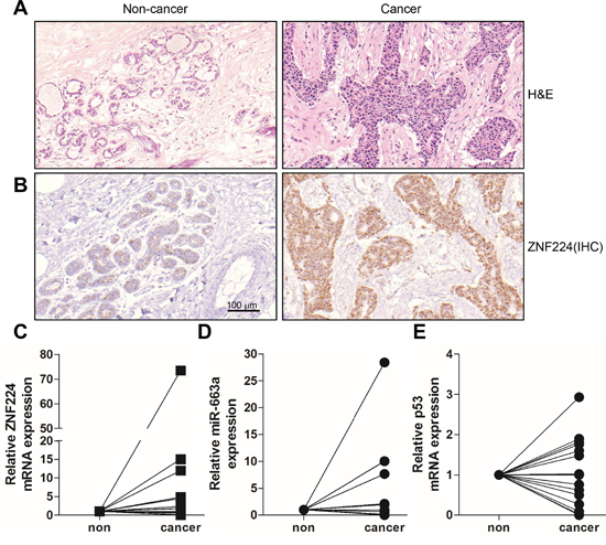 Next, we examined the transcript levels of ZNF224, miR-663a, p21, and p53 in ductal carcinoma of breast cancer patients. H&E and immunohistochemical staining showed that ZNF224 expression level was increased in cancer region compared to non-cancer region (15 of 18 cases) (Figure 7A and 7B), whereas ZNF224 mRNA expression was increased only in 8 cases of 18 cases (Figure 7C). In addition, miR-663a transcript level was increased in 7 of 14 cases, and p53 mRNA level was decreased in 8 cases of 16 cases (Figure 7D and 7E), whereas p21 mRNA was not detected (data not shown). Among the tested tissues, 3 cases (16.6%) showed that the increase of ZNF224 transcript level is correlated with increased miR-663a RNA (rs = -0.4862, p=0.0389) and decreased p53 mRNA (rs = -0.3446, p=0.046).