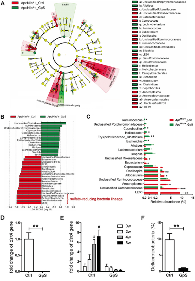 Figure 3: Identification of the key phylotypes in the fecal microbiome of GpS-treated and untreated ApcMin/+ mice. A. Taxonomic representations of the fecal microbiome. The differentially abundant taxa are presented with different colors using LEfSe method. The taxa from the untreated and GpS-treated ApcMin/+ mice are colored in red and green, respectively. The taxa with non-significant changes are colored in yellow. Each circle’s diameter represents the taxon abundance. B. Histogram of the LDA scores of fecal 16S rRNA gene sequences of the untreated controls (red color) and GpS-treated ApcMin/+ mice (green color). LDA scores characterized the magnitude of differential abundance in the microbial taxa between compared samples. C. The relative abundance of differentially abundant genera. Data is presented as the mean ± SEM (* P < 0.05, ** P < 0.01, *** P < 0.001, GpS versus control); n=5/group. D. Fold change of dissimilatory (bi)sulfite reductase (dsrA) gene in fecal genomic DNA samples obtained from mice treated with GpS for 8 weeks. The DNA subjected to qRT-PCR here was the same as the one applied to pyrosequencing. The same amount of DNA was used as template, and the level of dsrA gene was normalized to 16S rRNA gene. 16S rRNA gene is a segment of prokaryotic DNA found in all bacteria, and a universal primer set was used to detect the 16S rRNA gene of total bacteria. E. Time course of relative expression of dsrA gene. qRT-PCR was used to determine the level of dsrA gene and normalized to that of the total fecal bacteria, and expressed as fold change of the WT control group (see D) or fold change over the 0w sample (before treatment) of each mouse (see E). F. Relative abundance of Deltaproteobacteria. Data is presented as the mean ± SEM (** P < 0.01 GpS versus control samples; # P < 0.05 versus 0w samples); n=6/group.