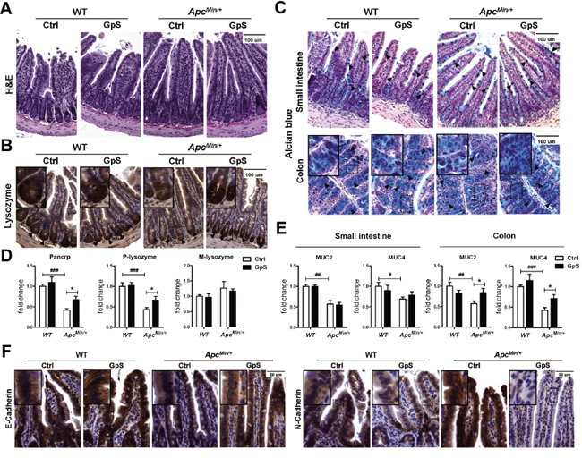 Figure 4: Effects of GpS on the intestinal epithelium. Intestinal tissues were collected after 8 weeks of treatment with or without GpS from the WT and ApcMin/+ mice. A. H&E staining. B. IHC staining of Paneth cells. C. Alcian blue staining of goblet cells. Hematoxylin and eosin (H&E) staining was used to visualize the formalin-fixed sections of small intestine. IHC staining of lysozyme was applied to identify the Paneth cells in the small intestine, and the dark brown at the bottom of the intestinal crypts indicates the presence of Paneth cells. Alcian blue staining was used to identify the goblet cells, and the blue staining indicates the presence of the goblet cells. D & E. The relative mRNA expression of Paneth cells related antimicrobial peptide (see D) and goblet cells related mucins (see E) was evaluated by qRT-PCR in the intestinal mucosal samples. Data was normalized to the expression of reference gene, and expressed as fold change of the WT control group. Data is presented as the mean ± SEM (* P < 0.05, GpS versus control samples; ## P < 0.01, ### P < 0.001, ApcMin/+ versus WT control samples); n=6/group. F. IHC staining of E-cadherin and N-cadherin. Positive expression is indicated by the brown color staining. Nuclear is stained and appeared in blue color that was done by hematoxylin staining.