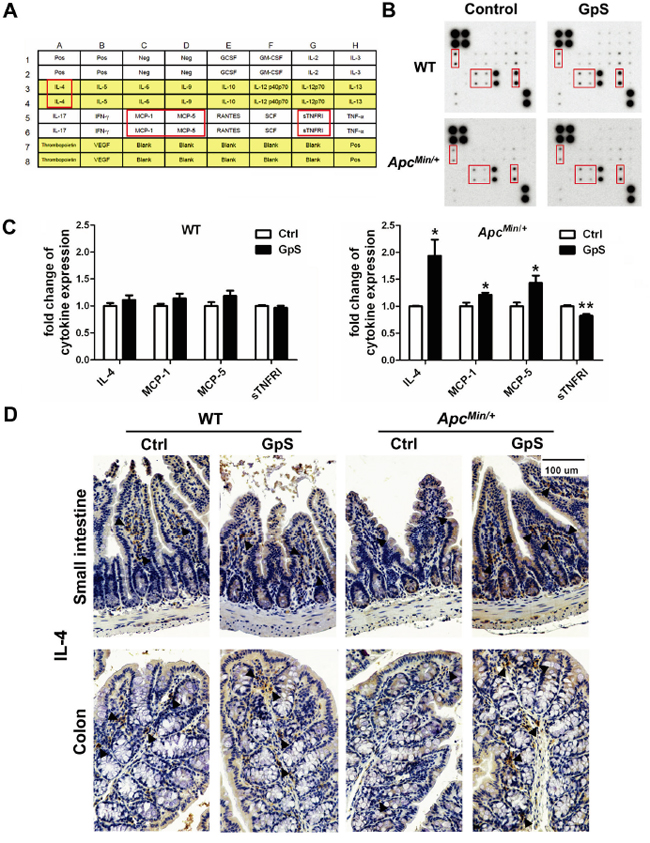 Cytokines have been suggested to play a crucial role in regulating immune response between the mucosal barrier and the commensal microbiota. To investigate the effect of GpS treatment on cytokine profiles, RayBiotech mouse cytokine array containing 22 main cytokines (Figure 6A) was used to detect the cytokines in the intestinal mucosal protein from experimental groups (Figure 6B). We observed that the levels of IL-4, MCP-1 and MCP-5 were significantly increased, whereas sTNFRI was significantly decreased in the intestinal mucosa from GpS-treated ApcMin/+ mice compared with the controls. However, the effect of GpS treatment was not apparent in the WT (Figure 6C). IHC staining of IL-4 further confirmed the finding in the cytokine array (Figure 6D). IL-4 has been reported to induce mucin secretion in goblet cells [34], which echoed our earlier results showing concurrent elevations of IL-4 and mucins were observed in the GpS-treated ApcMin/+ mice in contrast to the controls.