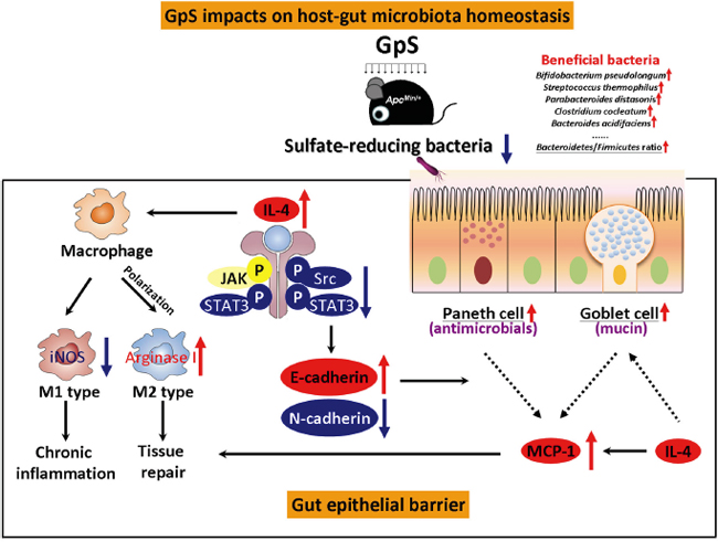 Figure 8: Summary of the impacts of GpS on host-gut-microbiota in ApcMin/+ mice. GpS impacts on host-gut-microbiota homeostasis through various means. GpS treatment increases beneficial bacteria, decreases sulfate-reducing bacteria, and improves gut epithelial barrier, which might contribute to its cancer preventive effects. The protective effects of GpS on the gut epithelial barrier (box in solid lines) might be partially through the induction of IL-4 secretion. On one hand, the elevation of IL-4 stimulates the M1 to M2 macrophages switching and facilitates intestinal tissue repair. On the other hand, IL-4 expression can also suppress the M1 induced marker, iNOS and reduce the chronic inflammation in the gut epithelial barrier. The elevated IL-4 cytokine might account for downregulation of p-Src and p-STAT3. As a result, it positively regulates E-cadherin and negatively modulates N-cadherin, presenting a reversion of disease to health status of gut epithelium upon GpS treatment. GpS also seems to improve of the intestinal epithelium by increasing Paneth and goblet cells. E-cadherin is required for Paneth cell maturation, while IL-4 can induce mucin secretion in goblet cells. The enrichment of goblet and Paneth cells facilitates the MCP-1 production and contributes to the tissue repair. Black arrows: pathways; red arrows: up-regulation; blue arrows: down-regulation; dashed lines: increase production.