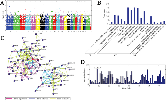 Figure 1: A. eGWAS for gastric cancer using a Fisher’s exact test. Plot of –log10(P value)(y axis) by chromosomal position(x axis). P values for each gene were calculated from our eGWAS across 13 microarray experiments with 679 gastric cancer case-control microarray samples(251 cases and 428 controls). The red line indicates P =0.00001, and there were 184 genes P<0.00001. B. These 184 differential genes were categorized into three groups—biological process, cellular component and molecular function—through gene ontology analysis. The results showed that there was enrichment in the cell cycle and collagen. C. D. Network analysis demonstrated that AURKA is the center of the network and consisted of 184 differential genes.