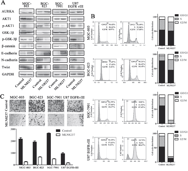 The cell viability of MGC-803, BGC-823, SGC-7901 and U87 EGFRvIII cell lines was measured by calculating the cell cycle distribution following MLN8237 treatment (Figure 2B). As shown in Figure 2B, the G0/G1 phase fractions of the control MGC-803, BGC-823, SGC-7901 and U87 EGFRvIII cells were 54.42%, 77.47%, 61.99% and 53.25%, respectively. However, treatment with MLN8237decreased the percentage of cells in the G0/G1 phase to 51.09%, 45.21%, 0.82% and 13.73%, respectively. Additionally, the G2/M phase fractions in the control cells were 8.97%, 5.11%, 10.37% and 9.12%, respectively. However, MLN8237 treatment increased the percentage of cells in the G2/M phase to 17.85%, 18.45%, 87.65% and 80.67%, respectively. The results suggested that MLN8237 treatment arrested the cells in the G2/M phase. As shown in Figure 3C, treatment with MLN8237 significantly suppressed the invasion of cells compared with that of the control group (P<0.01).