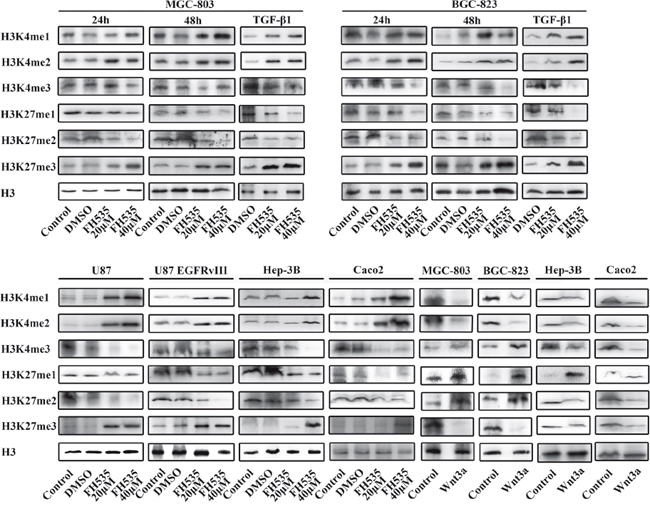 Wnt3a, a canonical Wnt ligand, activates the canonical Wnt/β-catenin signaling pathway. To evaluate whether the change in the methylation of H3K4 and H3K27 was relevant to the status of the Wnt/β-catenin signaling pathway, we enhanced Wnt/β-catenin signaling using exogenous Wnt3a. In MGC-803 and BGC-823 gastric cancer cells, Hep-3B hepatocarcinoma cells and Caco2 colon cancer cells, the levels of H3K4 me1/2 and H3K27 me3 were decreased, and those of H3K4 me3 and H3K27 me1/2 were increased with 100 ng/ml Wnt3a treatment for 24 hours.