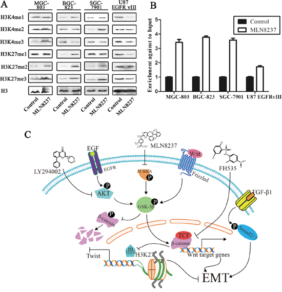 AURKA is a crucial candidate gene for gastric cancer and is relevant to the Wnt/β-catenin and PI3K/Akt signaling pathways. We suspected that AURKA regulates modification through the effects on the Wnt/β-catenin and PI3K/Akt signaling pathways. The results above showed that MLN8237 increased the expression of H3K27 me2/me3/AC in the gastric cancer cell lines MGC-803 and BGC-823, and SGC-7901 decreased the expression of H3K4 me1/me3 and H3K27 me1/me3 in U87 EGFRvIII cells. According to previous studies, H3K4 is associated with active genes in euchromatin, whereas H3K27 is associated with heterochromatic regions of the genome. Histone methylation plays an important role in diverse biological processes, including transcription, and can function in both gene activation and repression [14–16]. Additionally, different methylation states on the same residue can also localize differently. H3K4 me2/3 usually spans the transcriptional start site of active genes, whereas H3K4 me1 is a modification associated with active enhancers, and trimethylation of H3K27 is associated with gene repression [52].