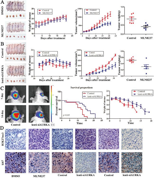 Figure 6: Treatment with MLN8237 and the decreased level of AURKA suppress gastric cancer and glioblastoma growth in vivo. A, B. Mice and tumor samples from the MGC-803/DMSO, MGC-803/MLN8237, MGC-803/Control and MGC-803/lenti-siAURKA groups. The mouse body weights, and tumor growth and weight were evaluated using the in vivo proliferation assay. C. Bioluminescent images from the control and lenti-siAURKA animals at 14 and 21 days after tumor implantation. Contrasting survival benefits were observed in mice, and mouse body weights were evaluated. D. Representative photomicrographs of immunohistochemistry for H3K27 me3 and ki67 on implanted tumor sections.