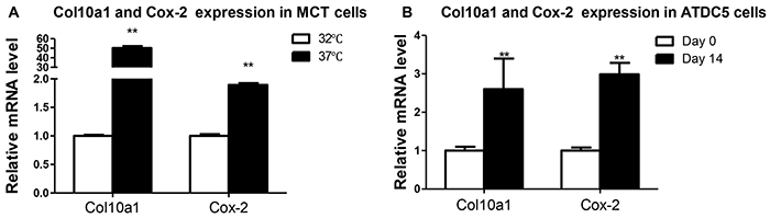 Figure 1: Col10a1 and Cox-2 expression in cell models of chondrocyte hypertrophy. A. Col10a1 and Cox-2 mRNA levels were examined in proliferative (32°C) and hypertrophic (37°C) MCT cells. Col10a1 shows 50 times higher while Cox-2 mRNA level is about 2-fold in hypertrophic MCT cells compared with that of proliferative MCT cells. B. Both Col10a1 and Cox-2 mRNA levels were 2-3 fold upregulated in ATDC5 cells undergoing hypertrophic differentiation (day 14) compared with chondrogenic ATDC5 cells (day 0). **p<0.01.