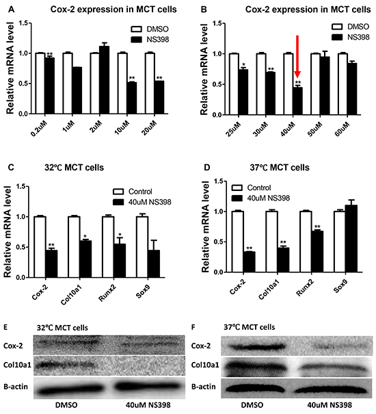 MCT and ATDC5 cells were treated with Cox-2 inhibitor NS398 (S1771, Beyotime, Shanghai, China). For MCT cells, when the cells grown in 32°C reached 70-80 confluence, various concentrations (0.2, 1, 2, 10, 20, 25, 30, 40, 50, and 60 μM) of NS398 or DMSO control were added to the medium and continued to either grow in 32°C or in 37°C for 1,2, or 3 days. Total RNAs from these cells were extracted and subjected to Cox-2 expression analysis using quantitative real-time RT-PCR. The optimum concentration of NS398 that showed the highest reduction of Cox-2 mRNA was selected. For ATDC5 cells, cells were grown in 37°C until they reached 70-80 confluence before adding various concentrations (2, 10, 20, 30, 40 μM) of NS398 and DMSO control and continued to grow in 37°C for 24 hours. The optimum concentration of NS398 was also determined by expression analysis of Cox-2 mRNA in ATDC5 cells using similar strategy as that with the MCT cells. ATDC5 cells were then continually cultured for 7, 10, and 14 days with optimized concentration of NS398 and DMSO control and for further analysis.