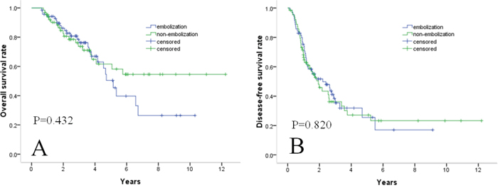 Among the 237 study subjects, 70 patients in the embolization group and 64 in the non-embolization group were classified as having medium-sized (3.1–5.0 cm) HCC and were further analyzed. There were no significant differences between the two groups with regard to age, gender ratio, diabetes mellitus, hypertension, hepatitis B surface antigen status, antibody to hepatitis C virus status, AFP levels, Child–Pugh classification, alanine aminotransferase levels, and platelet counts (Table 5). The respective 1-, 3-, and 5-year OS rates were 94%, 76%, and 53% in the embolization group and 95%, 74%, and 62% in the non-embolization group (Figure 2A). The differences between the groups were not significant (P = 0.432). The recurrence rates for medium-sized (3.1–5.0 cm) HCCs were 60% (n = 42) in the embolization group and 60.1% (n = 39) in the non-embolization group. The respective 1-, 3-, and 5-year DFS rates were 75%, 35%, and 26% in the embolization group and 68%, 36%, and 27% in the non-embolization group (Figure 2B). DFS rates between the two groups did not differ significantly (P=0.820).