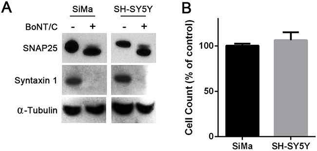 Figure 1: Naive human neuroblastoma cells are resistant to botulinum neurotoxin type C-induced cytotoxicity. A. Immunoblots showing cleavage of SNAP25 and syntaxin 1 in SiMa and SH-SY5Y neuroblastoma cells following application of BoNT/C (100 nM). BoNT/C hydrolyses 8 and 35 amino acids from the C-termini of SNAP25 and syntaxin1, respectively [16]. Alpha-tubulin was used as a loading control. B. Graph showing undifferentiated neuroblastoma cell counts in the presence of 100 nM BoNT/C expressed as a percentage of untreated cells (n=3, mean ± SEM).