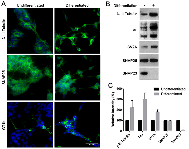 Figure 2: Differentiated SiMa cells exhibit enhanced expression of common neuronal markers and a decrease in SNAP23 content. A. Immunofluorescent images showing expression of βIII-tubulin, GT1b ganglioside and SNAP25 in SiMa cells before and after differentiation. B. Immunoblot showing an increase in expression of neuronal βIII-tubulin, SV2A and tau proteins upon differentiation. SNAP25 content remains stable during differentiation whereas SNAP23 content drops significantly. C. Graph showing quantification of immunoblotting signals for indicated proteins (n=3, mean± SEM).
