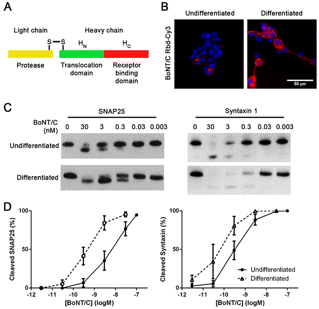 Figure 3: Differentiation of SiMa cells results in enhanced botulinum type C binding and SNARE cleavage. A. Schematic showing three constituent parts of botulinum neurotoxin. Receptor-binding domain (Rbd, red) can be expressed separately and labelled with a fluorescent dye. B. Fluorescent image showing that differentiated SiMa cells exhibit enhanced binding of fluorescent Rbd-Cy3. Immunoblot C. and its quantification D. demonstrating ten-fold increase in SNAP25 and syntaxin 1 cleavage induced by BoNT/C upon differentiation of SiMa cells (n=3, mean± SEM).
