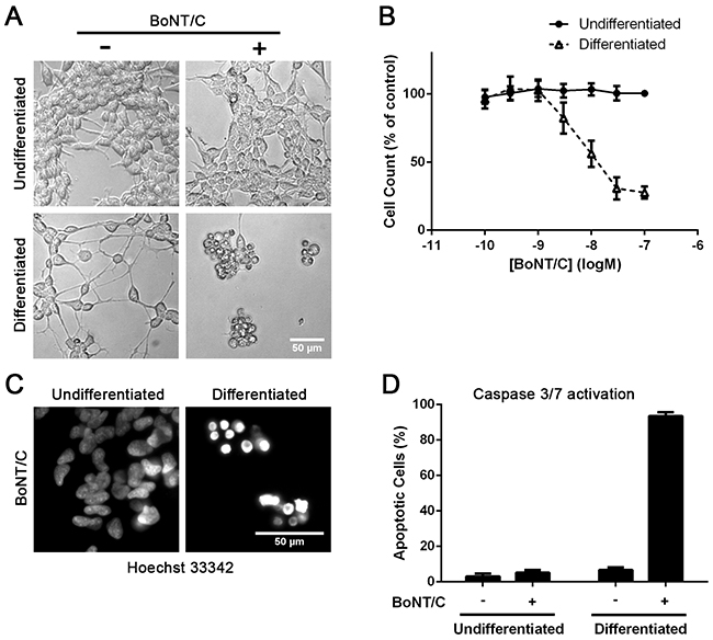 Figure 4: Differentiated SiMa cells undergo BoNT/C-induced apoptotic death. A. Microscopy images showing dying cells only in the case of differentiated neuroblastoma cells in the presence of BoNT/C (30 nM). B. Graph showing dose-dependent cytotoxic effect of BoNT/C on SiMa cells, before and after differentiation, normalised to botulinum-untreated controls (EC50=10 nM, n=3, mean± SEM). C. Intensive Hoechst nuclear staining demonstrates apoptosis in the case of BoNT/C-treated neuroblastoma cells as confirmed by a graph showing caspase 3/7 activation (n=3, mean± SEM) D.