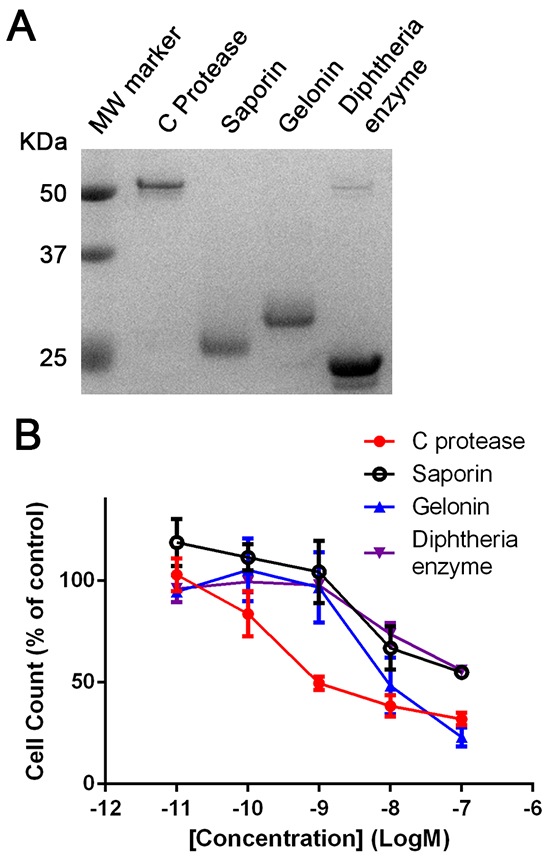 Figure 5: Botulinum type C protease is cytotoxic following intracellular delivery. A. SDS gel showing botulinum type C protease and the indicated translation-inhibiting enzymes. B. Graph showing ten-fold higher vulnerability of differentiated SiMa cells to the botulinum protease (EC50=0.5 nM) in comparison to common translation-inhibiting enzymes. All enzymes were delivered into differentiated SiMa cells using LF3000 lipofection reagent (n=3, mean± SEM). Cell counts were normalised to botulinum-untreated controls (LF3000 alone).