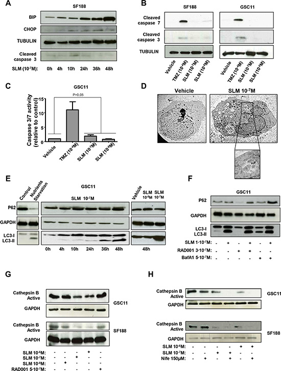 Figure 2: SLM induces ER stress and an aberrant autophagic flux. (A) SF188 cells were seeded at a density of 1 × 10–5 cells per well in a 6-well plate. The following day, cells were incubated with SLM (1 × 10–7 M) and collected at the indicated times. Samples were analyzed by western blot for BiP, CHOP and cleaved caspase 3. α-Tubulin was used as loading control. The western blot shown is representative of three independent experiments. (B) SF188 and GSC11 cells were incubated with SLM (1 × 10–8 M or 1 × 10–7 M) or TMZ (1 × 10–4 M). Cells were collected after 48 h, and samples were analyzed by western blotting for cleaved caspase 7 and cleaved caspase 3. Tubulin was used as the loading control. The western blot shown is representative of three independent experiments. (C) GSC11 cells were seeded at a density of 5 × 10–3 cells per well in 96-well plates. The following day, cells were incubated with either TMZ or SLM at the indicated concentration. 48 hours after treatment, caspase -3 and -7 activities were measured with the Caspase-Glo® 3/7 Assay. The results are expressed as mean values ± SD from three independent experiments and caspase -3 and -7 activities in treated cells are represented relative to the corresponding activities in non-treated cells. (D) Transmission electron microscopy analysis. GSC11 cells were treated with SLM (1 × 10–7 M) and harvested 48 h later. The micrographs shown are representative of the morphologic features observed (1600× magnification). (E) GSC11 cells were incubated with SLM (1 × 10–8 M or 1 × 10–7 M) and collected after different incubation times. Samples were analyzed by western blotting for p62 and LC3-I to LC3-II conversion. GAPDH was used as the loading control. The western blot shown is representative of three independent experiments. Nutrient-starved cells were used as a positive control for autophagy. (F) GSC11 cells were seeded at a density of 1 × 105 cells per well in 6-well plates. After 24 h of culture, cells were incubated with RAD001, SLM or bafilomycin A1 (BafA1) at the indicated concentrations. Cells were collected 48 h later and subjected to western blot analyses. The western blot shown is representative of three independent experiments. (G) GSC11 and SF188 cells were incubated with SLM and RAD001 at the indicated doses. Cells were collected 48 hours after treatment, and samples were analyzed by western blotting for active cathepsin B; GAPDH was used as the loading control. (H) GSC11 and SF188 cells were incubated with Nife (1, 5 × 10–4 M) alone or in combination with SLM (10–7 M or 10–8 M). Cells were collected after 48 h, and samples were analyzed by western blot for active cathepsin (B) GAPDH was used as the loading control. The western blot shown is representative of three independent experiments.