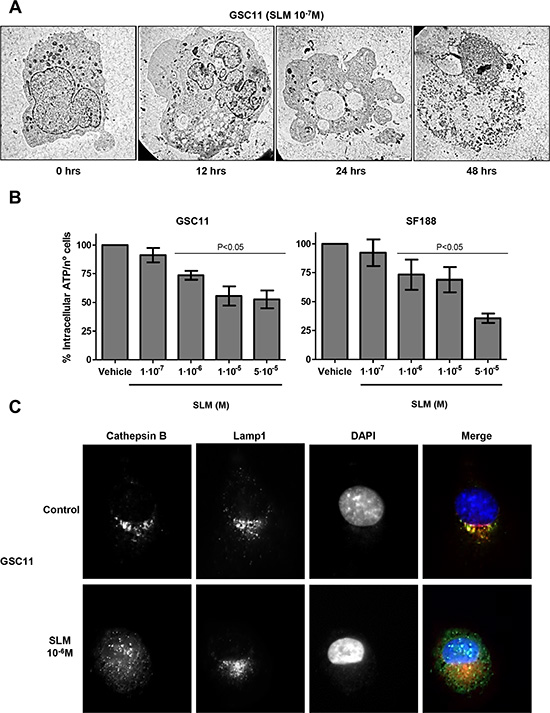 Figure 3: SLM induces necrosis. (A) GSC11 cells were treated with SLM (10–7 M), and cells were collected 0, 12, 24 and 48 hours later. The micrographs shown are representative of the morphology of treated cells (× 1000 magnification). (B) GSC11 and SF188 cells were seeded at a density of 1 × 105 cells per well in a 6-well plate. The following day cells were incubated with SLM and 48 hours later the levels of ATP were measured. Data are presented as the mean ± SD of three independent experiments. (C) GSC11 cells were incubated with SLM, at the indicated concentrations, and, 48 hours later, cathepsin B (green) and Lamp1 (red) localization were assessed with immunofluorescence. Representative images for three independent experiments are shown; DAPI (blue) was used for nuclear staining.