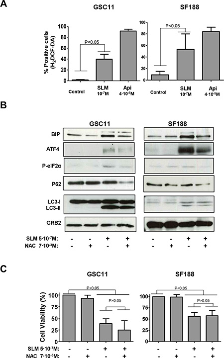 Figure 5: SLM treatment induced oxidative stress. (A) GSC11 and SF188 cells were seeded at a density of 1 × 105 cells per well in 6-well plates. Next day cells were incubated with SLM or Apigenine (Api; as a positive control) at the indicated concentrations. Cells were collected 48 hours later and stained with H2DCF-DA (4 μM). Cells were then analyzed by flow cytometry. (B) GSC11 and SF188 cells were seeded at a density of 1 × 105 cells per well in a 6-well plate. The following day, cells were incubated with SLM, NAC or both drugs at indicated doses. Cells were harvested three days later, and protein samples were analyzed by western blot for BIP, ATF4, P-elF2α, p62 and LC3-II conversion. GRB2 was used as loading control. Shown is a representative western blot of three independent experiments. (C) GSC11 and SF188 cells were seeded at a density of 1 × 105 cells per well in a 6-well plate. The following day cells were incubated with SLM, NAC or both drugs at the indicated doses. Three days later cells were counted in a Neubauer chamber. The results are represented as the percentage of cell viability relative to non-treated cells; the mean ± SD from three independent experiments is shown.