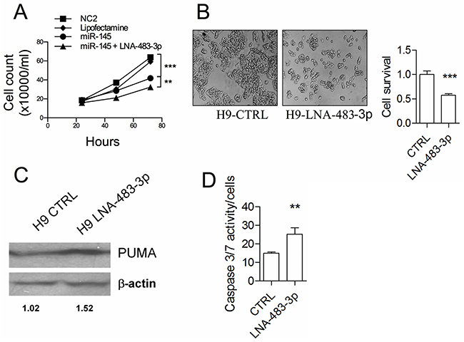 To assess the role of miR-483-3p in cell protection, we transfected HepG2 cells with miR-145-5p together with an anti-miR-483-3p oligonucleotide. The combination resulted in increased cell growth inhibition (p<0.002) (Figure 3A). We also inhibited miR-483-3p expression by LNA oligonucleotide in the H9 clone. This treatment reduced cell growth up to 40% at 72 hours (p<0.0001) (Figure 3B), caused an increase of PUMA expression (Figure 3C), and induced caspase 3/7 activity (Figure 3D). A key role of PUMA was confirmed by a specific siBBC3, which abrogated the induction of caspase activity after the inhibition of miR-483-3p (Supplementary Figure S2). These results support the hypothesis that the miR-483-3p confers resistance to TP53-dependent apoptosis in HepG2 cells over-expressing the miR-145-5p.