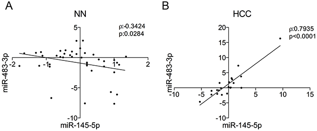 Figure 4: miR-145-5p/miR-483-3p correlations in non-neoplastic liver and hepatocellular carcinoma. The miR-145-5p and miR-483-3p expressions obtained by microarray analysis or RT-qPCR were evaluated in A. non-neoplastic liver samples (NT) and B. hepatocellular carcinomas (HCC) respectively. Spearman correlation (ρ) and correlation p value (p) are indicated.