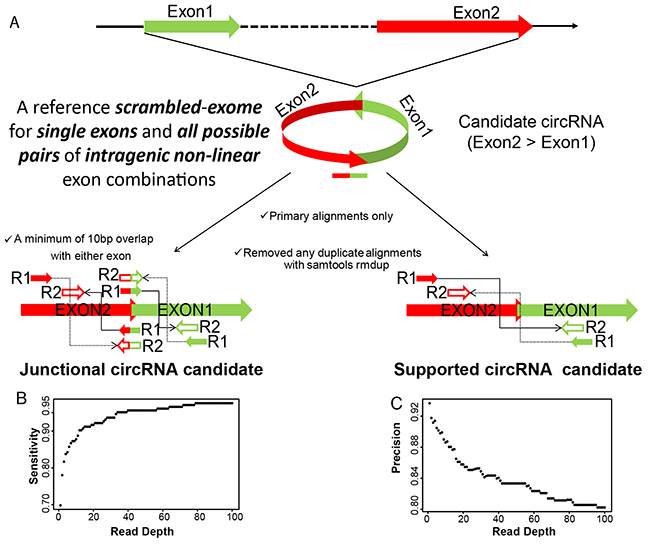 Figure 1: A. circRNA detection pipeline. circRNA candidates are inferred from alignment of paired-end RNA-seq data to a reference scrambled exome. Read-pair alignments that contain apparent backsplice junction are reported as either junctional or supportive evidence for the backspliced exon junctions. B. and C. Sensitivity and Precision of circRNA detection pipeline. Simulated reads at different read depths representing the expression level of randomly selected backsplice junctions mixed with a background of their canonical transcripts were run through the detection pipeline. Measurements of the correctly called circRNA junctions (true positives;TP), incorrectly called junctions (false positives, FP) and unidentified junctions (false negatives, FN) were used to define sensitivity and precision as TP/(TP+FN) and TP/(TP+FP), respectively.