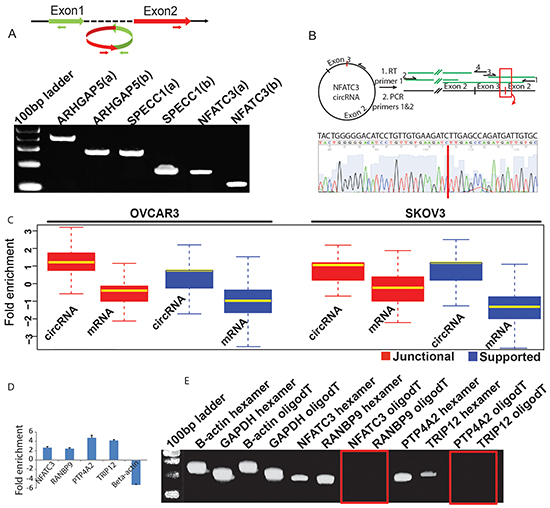 Figure 2: A. Divergent primers become properly inward facing and identify backspliced junction for circRNAs. Two sets of outward facing primers (a & b) with respect to genomic sequence were designed to amplify the backsplice junction sequence for circRNA candidates from ARHGAP5, SPECC1 and NFATC3 genes and each produced an expected size band in the qPCR assay (Supplementary File S1). B. Sanger sequencing confirms head-to-tail splicing for NFATC3. RNA samples were reverse transcribed with thermo-stable reverse transcriptase and a primer complementary to the coding RNA strand. PCR on the cDNA produced with primers 1 and 2 resulted in large amounts of product that could be Sanger sequenced. Primers 1 to 4 were used in sequencing, with coverage from each primer indicated in green. Expansion of the sequence provided by primer 3 shows complete coverage of the non-canonical junction. C. circRNA candidates are enriched after the RNase R digestion. Total RNA from OVCAR3 and SKOV3 cell lines was treated with RNAse R to test the sensitivity of the identified circRNA candidates to exoribonuclease digestion. Boxplots represent FPKM (Fragments per kilobase of exons per million mapped fragments) fold change for RNAse R treated vs. untreated samples and shows a significant enrichment of both junctional and supported circRNAs (n=7903) compared to mRNA (n=2785) in the RNAse R digested samples. Only genes that produced at least one detectable circular isoform were considered for this analysis. D. qPCR confirms RNAse R enrichment for circular junctions. Total RNA from OVCAR3 cell line was first treated with DNase1 to avoid any DNA contamination and then part of it was subjected to the RNase R digestion followed by RT-PCR for each sample. The four putative circular RNAs show enrichment for the backsplice junction compared to the linear RNA from beta-actin used as a negative control. E. Candidate circRNAs are devoid of Poly-A tails. The four candidate circRNAs were also tested for the presence /absence of a ploy-A tail by using either oligo (dT) or random hexamers to amplify the total RNA followed by a qPCR assay with primers specific for backsplice junctions of candidate circRNAs and linear RNA of b-actin and GAPDH genes. While both oligo (dT) and random hexamers could amplify the RNA from beta-actin and GAPDH, only random hexamers showed detectable PCR products for the four tested candidate circRNAs. The red rectangles show absence of any PCR bands for the backsplice junctions.