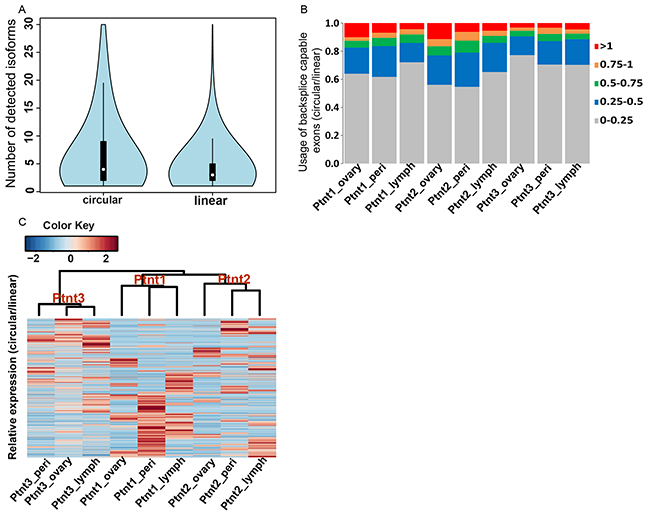 Figure 3: A. Isoform diversity of candidate circRNA versus linear transcripts. Violin plots - a combination of boxplot and kernel density function compares the abundance levels of candidate circRNA isoforms and cufflinks assembled linear transcripts for 7121 genes for which at least one detectable backsplice junction was observed. The diversity of candidate circRNA isoforms is significantly higher (wilcoxon test; p-value 3.324e-07) than that of linear transcripts in ovarian cancer. B. Usage of backsplice capable exons as linear and circular forms. For the backsplice junction forming exons, ratio of read pairs supporting the scrambled form to the read pairs supporting the linear form defines the relative abundance of candidate circRNA expression. Most backsplice capable exons are relatively more abundant in the linear form, however a significant proportion (5-10%) of these are preferentially expressed as circRNA form. Colors indicate ratio of circular to linear expression. C. Heatplot of relative abundance levels. Each line in the plot is a circRNA candidate as defined by two backsplice capable exons with colors indicating relative abundance levels of circular over linear expression for the two exons. Hierarchically clustered heatmap of the relative abundance levels shows the clear trends of stronger intra-patient homogeneity of circRNA expression as indicated by a distinct dendrogram branch for each patient. Sub-branching for patients 1 & 2 further reveals a primary tumor and metastases specific expression trend for these groups.