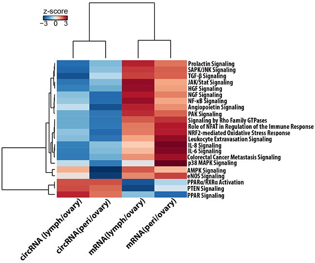 Table 2: Number of differentially expressed genes and circRNA candidates between primary ovarian tumor versus peritoneal and lymph node metastases lesions
