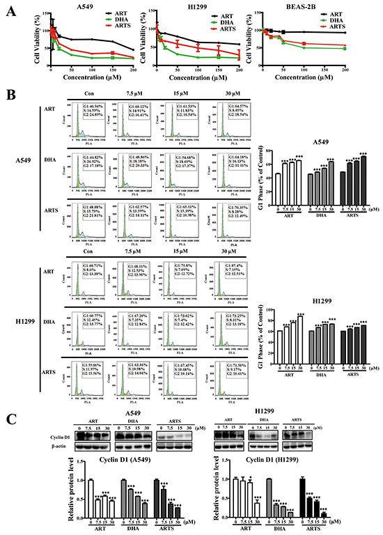 ART, DHA, and ARTS suppressed cell viability and induced G1 arrest by inhibiting cyclin D1 in A549 and H1299