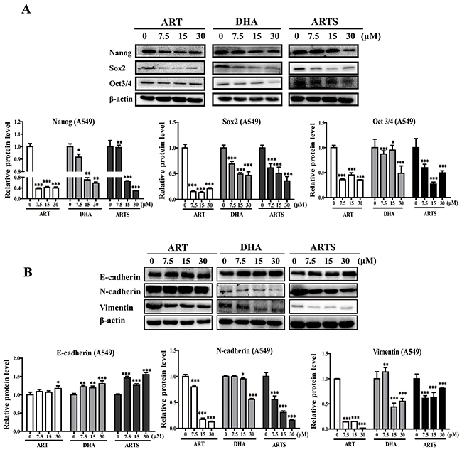 Figure 3: Epithelial–mesenchymal transition (EMT) and cancer stem cells (CSCs) were regulated by ART, DHA, and ARTS in A549 in vitro. A. Expression of CSCs regulatory proteins was determined by Western blot in A549 with antibodies against nanog, sox2, and oct3/4. B. Western blot analysis was performed for E-cadherin, N-cadherin, and vimentin. Data shown were the means ± SD. *p < 0.05, **p < 0.01, ***p < 0.001, compared with the control group (Con, control).