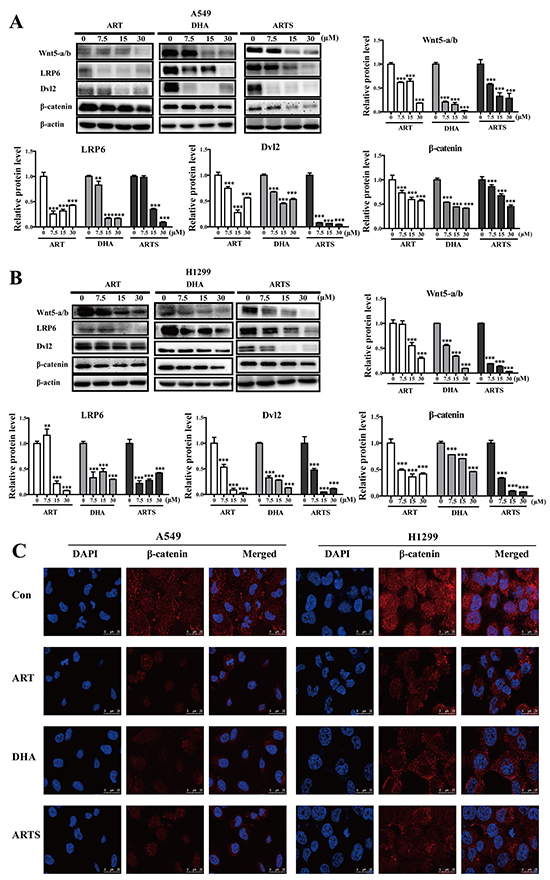 Figure 4: ART, DHA, and ARTS decreased Wnt5-a/b-triggered suppression of downstream proteins in vitro. A. A549 cells were harvested, and Western blot analysis was conducted for Wnt5-a/b, LRP6, Dvl2, and β-catenin. B. H1299 cells were harvested, and Western blot analysis was conducted for Wnt5-a/b, LRP6, Dvl2, and β-catenin. Data shown were the means ± SD. **p < 0.01, ***p < 0.001, compared with the control group. C. Representative confocal imaging of nuclei (blue), β-catenin (red), and nuclei/β-catenin double-stained cells at the level of β-catenin cytoplasm and nuclear localization after 48 h of ART, DHA, and ARTS treatments. Nuclei were counterstained with DAPI (scale bar: 25 μm).