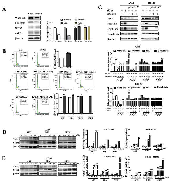 Figure 5: ART, DHA, and ARTS were partially dependent on Wnt/β-catenin signaling. A. A549 cells were harvested, and Western blot analysis was conducted for β-catenin, Wnt5-a/b, NKD2, and Axin2 with or without IWP-2. B. Percentage of A549 cells in the G1 phase with 0 and 30 μM ART, DHA, and ARTS treatments accompanied with or without IWP-2. C. Cells were transfected with Wnt-5a siRNA or control siRNA before ART, DHA, and ARTS (30 μM) treatments. Wnt5a, β-catenin, sox2, and E-cadherin protein levels were detected by Western blot analysis. D. A549 cells were harvested, and Western blot analysis was performed for Axin2 and NKD2. E. H1299 cells were harvested, and Western blot analysis was conducted for Axin2 and NKD2. The data represent mean ± SD. *p < 0.05, **p < 0.01, ***p < 0.001, compared with the control group (Con, control).