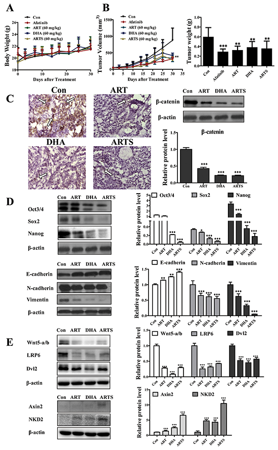 Figure 6: ART, DHA, and ARTS suppressed cell proliferation in A549 xenograft mice model by inhibiting Wnt/β-catenin, EMT and CSCs in vivo. A. Body weights of mice during the ART, DHA, and ARTS treatments. B. Tumor volume was measured during the experiment, and tumor weights of A549 xenografts were measured after four weeks of treatment. C. High magnification (400×) of tumor sections treated with or without ART, DHA, and ARTS. A high signal corresponding to β-catenin protein in control group was detected (bar: 50 μm). Protein expression of β-catenin in lysates of tumor tissue from mouse was detected by Western blot. D. Protein expressions of markers of EMT and CSCs, namely, E-cadherin, N-cadherin, vimentin, nanog, sox2, and oct3/4 were detected by Western blot. E. Protein expressions of Wnt5-a/b, LRP6, Dvl2, Axin2, and NKD2 in lysates of tumor tissues from mice were detected by Western blot. Data shown were the means ± SD, *p < 0.05, **p < 0.01, ***p < 0.001, compared with the control group (Con, control).