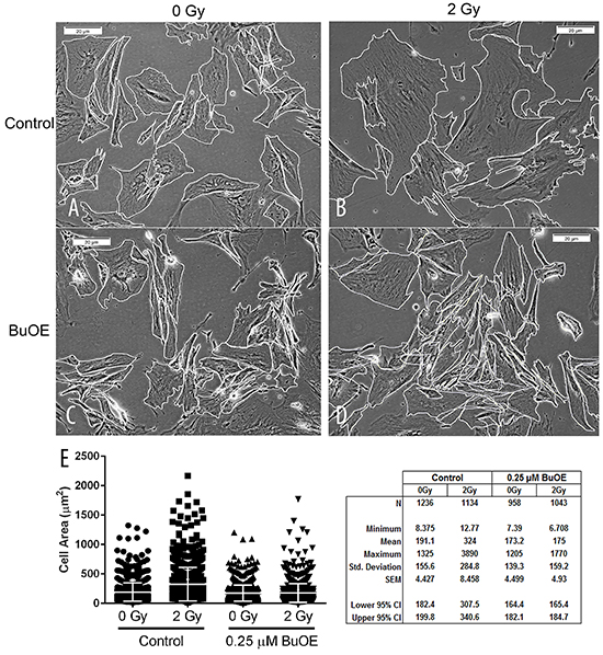 Figure 2: MnTnBuOE-2-PyP mitigates radiation-induced increase in cell size of primary colorectal fibroblasts. Images of mouse colorectal fibroblasts maintained in media with PBS (Control) or 0.25 μM MnTnBuOE-2-PyP (BuOE) were either sham irradiated A & C. or treated with 2 Gy x-rays B & D. then harvested 48 hours later. After cells were imaged, their borders were manually traced in ImageJ to calculate cell areas. E. The mean cell area was increased significantly (p<0.0001) in control cells receiving 2 Gy as compared to the unirradiated population. When cells were grown in BuOE there was no significant increase (p=0.99) in cell size following radiation treatment. The combined data of 3 independent experiments is presented here as mean and std dev. Significance was determined using 1-way ANOVA followed by post hoc Tukey’s test for multiple comparisons.