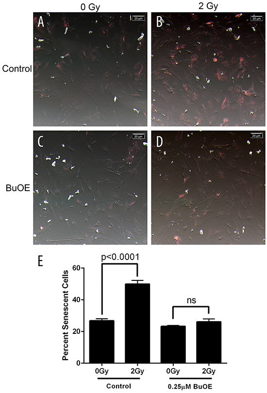 Figure 3: Radiation-induced senescence is reduced in primary colorectal fibroblasts grown in MnTnBuOE-2-PyP. Mouse colorectal fibroblasts maintained in media with PBS (Control) or 0.25 μM MnTnBuOE-2-PyP (BuOE) were either sham irradiated A. & C. or treated with 2 Gy x-rays B & D., 48 hours later cells were stained for SA-β-gal expression. Cells were imaged with an inverted brightfield microscope, these images were inverted (A-D) to aid in counting SA-β-gal positive (pink) cells. E. Quantification of senescent cells. SA-β-gal expression is significantly increased (p<0.0001) in control cells receiving 2 Gy as compared to the unirradiated population. When cells were grown in BuOE there was no significant increase (p=0.22) in SA-β-gal expression following radiation treatment. All data are representative of the mean and standard deviation and were obtained from 3 independent experiments. The differences of mean percent senescent cells were analyzed for significance using 1-way ANOVA followed by post hoc Tukey’s test for multiple comparisons.
