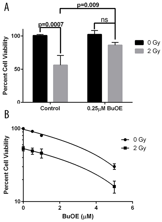 Figure 4: Cell viability following radiation treatment in the presence of MnTnBuOE-2-PyP. A. Viability of mouse primary colorectal fibroblasts. Fibroblasts were maintained for two weeks in media with PBS (Control) or 0.25 μM MnTnBuOE-2-PyP (BuOE) were either sham irradiated or treated with 2 Gy x-rays. Cultures were assayed for cell viability by measuring the ability to reduce MTT to formazan. Cell viability is significantly decreased (p=0.0007) in control cells receiving 2 Gy as compared to the unirradiated population, but this loss in viability is inhibited with BuOE treatment (p=0.009). Statistical significance and p-values were determined using 1-way ANOVA analysis followed by post hoc Tukey’s test for multiple comparisons. B. Viability of human colorectal cancer cells. HT-29 cells were either sham irradiated or given 2 Gy x-rays in the presence of increasing doses of BuOE [0, 0.5, 1, 5 μM] Cultures were grown an additional 12 days in the presence of BuOE or PBS for control, then assayed for cell viability measured as the ability to reduce MTT to formazan. BuOE does not protect cancer cells from radiation induced damage (p<0.001) as determined by linear regression analysis of the difference between drug dose response curves with or without radiation treatment. All data are representative of the mean and standard deviation and were obtained from 3 independent experiments.