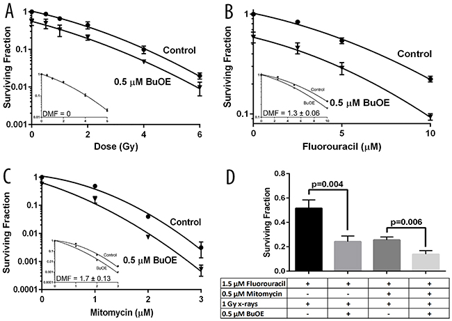 Figure 5: MnTnBuOE-2-PyP does not protect colorectal cancer cells from common therapeutic regimens used clinically for colorectal and anal cancers. The effect of MnTnBuOE-2-PyP (BuOE) on dose response to x-radiation or chemotherapy or combinations of those therapies was determined by clonogenic survival. A. HT-29 cells growing in log phase were treated overnight with 0.5 μM BuOE then treated with [0, 0.5, 1, 2, 4, 6 Gy] x-rays. The surviving fraction was significantly reduced (p<0.0001) in BuOE treated cells, however the dose response due solely to radiation was not enhanced or diminished by the addition of BuOE (DMF=0, A-inset). B. HT-29 cells growing in log phase were treated overnight with 0.5 μM BuOE then treated with [0, 2.5, 5, 10 μM] 5-fluorouracil for 24 hours. The surviving fraction was significantly reduced (p=0.0005) in BuOE treated cells, additionally the dose response due solely to 5-fluorouracil was enhanced by the addition of BuOE (DMF=1.3 ± 0.06, B-inset). C. HT-29 cells growing in log phase were treated overnight with 0.5 μM BuOE then treated with [0, 1, 2, 3 μM] Mitomycin for 2 hour. The surviving fraction was significantly reduced (p<0.0001) in BuOE treated cells, the dose response due solely to Mitomycin was enhanced by the addition of BuOE (DMF=1.7 ± 0.13, C-inset). D. HT-29 cells were exposed overnight to 0.5 μM BuOE or PBS, cells were then treated with 1.5 μM 5-fluorouracil for 24 hours. Half of those cells were treated with 0.5 μM Mitomycin during the final hour of 5-fluorouracil incubation. All of the samples were irradiated with 1 Gy x-rays and then seeded for clonogenic survival. The combination of 5-fluorouracil and radiation was significantly enhanced in the presence of BuOE (p=0.004) and likewise the combination of 5-fluorouracil, Mitomycin, and radiation was significantly enhanced (p=0.006) by BuOE treatment. All data are representative of the mean and standard deviation and were obtained from 3 independent experiments.
