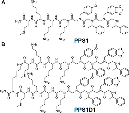 Synthesis of PPS1 compound was done on NovaSyn TGR resin (EMD Millipore, MA). First three amino acids, Fmoc-Met-OH, Fmoc–D-Lys(Boc)-OH and Fmoc-Lys(Boc)-OH were loaded to the resin after Fmoc removal each time. Then 5-mer peptoid region containing Boc-Diaminobutane, 4-methoxybenzylamine, (R)-Methylbenzylamine, Piperonylamine and (R)-Methylbenzylamine was completed using microwave assisted peptoid synthesis protocol. At the end, beads were washed with DCM and cleaved off with TFA cleavage cocktail (Please refer to Supplementary Experimental Procedures for detailed procedures).
