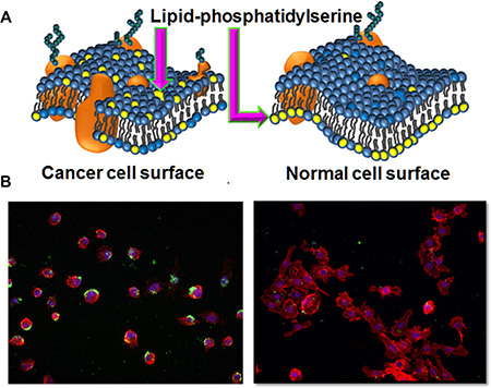 Figure 2: Lipid-PS expression difference between cancer vs normal cells. (A) Schematic representation of membrane lipid asymmetry in cancer and normal cells and lipid-PS externalization on cancer cells. (B) Staining of HCC4017 (left) and HBEC30KT (right) with PS targeting bavituximab antibody. Only HCC4017 cells express PS.