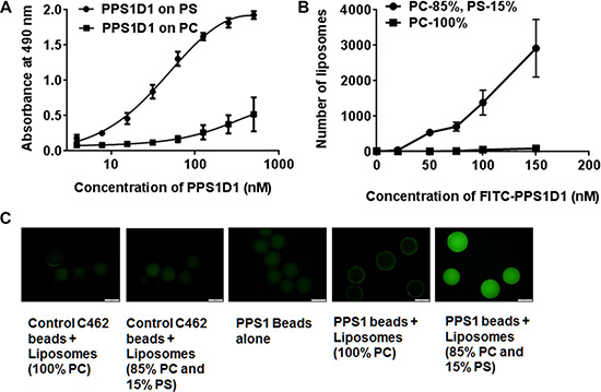 Figure 3: PPS1D1 recognize lipid-PS. (A) ELISA binding assay of FITC-PPS1D1 with phosphatidylcholine (PC) and phosphatidylserine (PS) indicates that FITC-PPS1D1 only binds to PS. (B) Binding of liposomes made of 100% PC and 85% PC–15% PS to PPS1D1-FITC. Only 15% PS containing liposomes bound to FITC-PPS1D1 (Error bars represent standard deviation). (C) Binding of liposomes made of 100% PC and 85% PC–15% PS to PPS1 and control PC462 carrying tentagel beads. Only 15% PS containing liposomes bound to PPS1 beads, but not liposomes with no PS (100% PC). Control PC462 does not bind to both liposome types.
